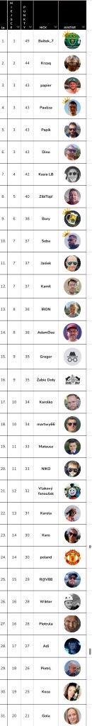 Aktualne wyniki, zostało nam ostatnie typowanie. Na wypełniony formularz czekam do niedzieli, tj. 14.07, godz. 8:00.Chyba będzie to historyczny moment typowaczy i druga korona dla zwycięzcy 😅👍💪